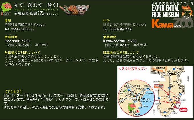 内容体感型動物園iZoo & 体感型カエル館kawaZoo共通 入園券 ご招待券(ペア・大人2枚) 大人(中学生以上)事業者有限会社レップジャパン備考※画像はイメージです。 ※イズーとカワズーの共通入園券となります。 ※発行より1年間有効(除外日なし) ※ただし、イズー、カワズーいずれか一方の施設で利用済の本券の有効期限は、利用した日を含め2日間。各施設1日限り入園可能です。 ※各施設へのご移動はお客様各自でお願いします。 ・ふるさと納税よくある質問はこちら ・寄附申込みのキャンセル、返礼品の変更・返品はできません。あらかじめご了承ください。【ふるさと納税】イズー カワズー (ペア・大人2名) 共通入園券 爬虫類 動物園 河津町 観光 【チケット 入場券 優待券 動物園】 日本最大級の爬虫類の動物園iZoo(イズー)と姉妹園KawaZoo(カワズー)の共通入園券セットです。 一般的な動物園・水族館よりも近い距離で動物を体感することが出来ます。小さなお子様から大人の方、爬虫類ファンからそうでない方まで、日々変化する展示で何度来てもお楽しみいただけます。園内にはガラパゴスゾウガメをはじめ、世界中の希少な動物を多数飼育・展示しています。両園ともに年中無休でお待ちしております。 見て!ふれて!おどろく!体感型動物園 iZoo【イズー】 iZoo【イズー】は日本最大の爬虫類の動物園です。本施