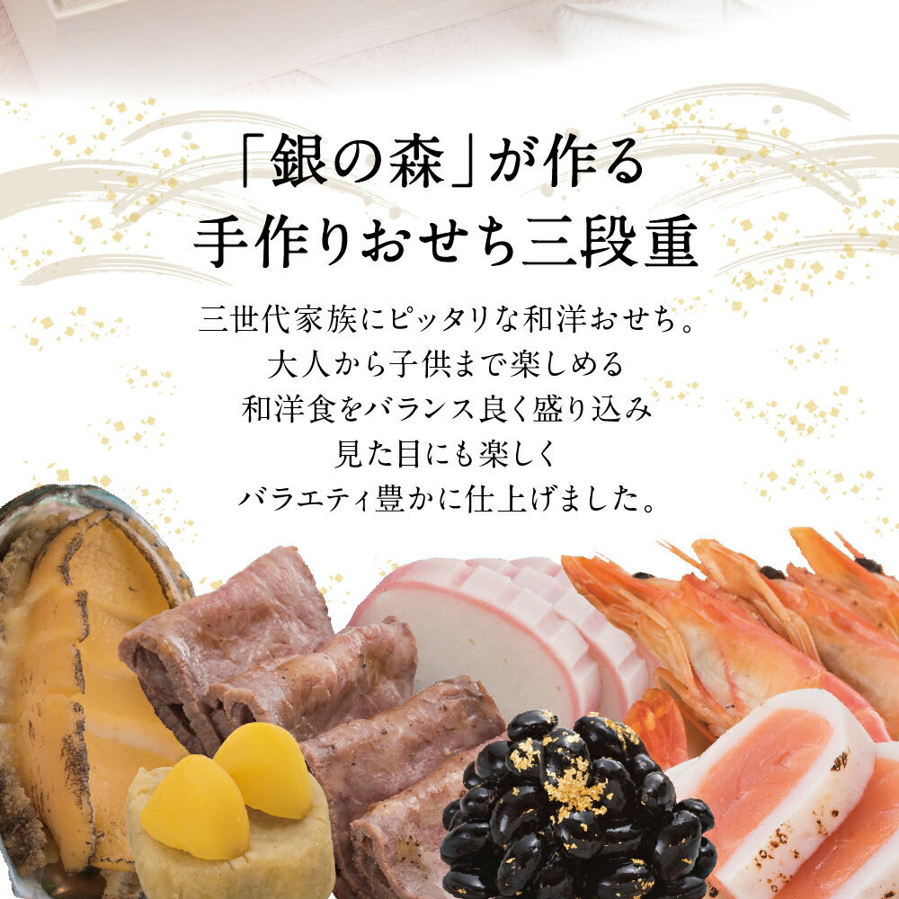 商品詳細 (早期受付期間:9月1日〜11月15日)※こちらの商品は冷凍便にて12月30日にお届けいたします。※配送時間は指定できませんのでご了承ください。 「銀の森」が作る“手作りおせち3段重”です。 25年の経験で培った技術で昨年は年間30万セットを製造し、全国の皆様より信頼を得ているおせちです。 食材の調達から加工調理、盛付け、梱包、出荷までを全て自社で行っています。 派手・・・