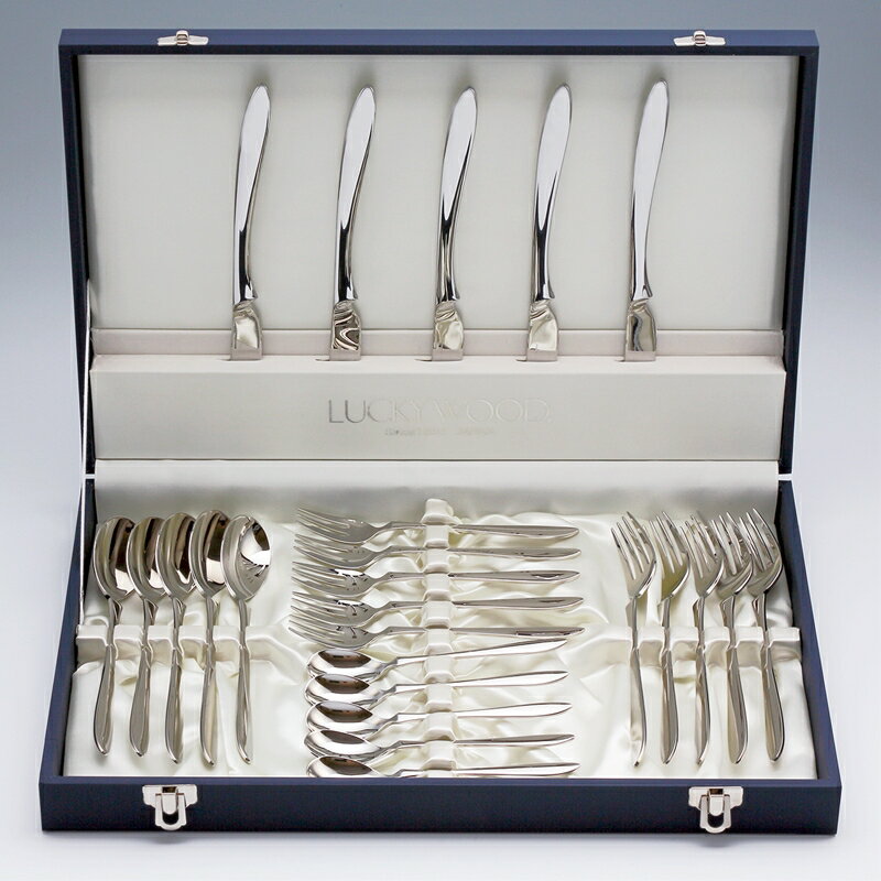 《 商品の説明 》 洗錬されたスリムラインでシンプルかつスタイリッシュなカトラリー。手軽な使いやすさを重視した無駄のない美しい流線型で、標準サイズよりも少し長めのスマートデザインです。グッドデザイン賞受賞 名称 ラッキーウッド〈プレコ〉ディナー25本セット 内容・サイズ デザートスプーン(約190mm)×5本 デザートフォーク(約190mm)×5本 デザートナイフ/共柄・鋸刃(約229mm)×5本 ティースプーン(約135mm)×5本 ケーキフォーク(約154mm)×5本 ケースサイズ : 約390×260×55mm ※デザートサイズはご家庭でカレーやパスタ、肉料理に使用するカトラリーサイズです。 産地・原材料名 産地:新潟県燕市 材質:18-10ステンレススチール ※ナイフは刃物用の特殊なステンレス素材が使用されています。 提供元 小林工業株式会社 ・ふるさと納税よくある質問はこちら ・商品到着後、中身のご確認を必ずお願いいたします。お申込みと違う商品が届いたり、不良品・状態不良がございましたら問合せ窓口までご連絡ください。お時間が過ぎてからの対応はできかねますので予めご了承ください。 ・また、寄附者の都合により返礼品がお届けできない場合、返礼品の再送は致しません。 あらかじめご了承ください。 ・寄附申込みのキャンセル、返礼品の変更・返品はできません。あらかじめご了承ください。