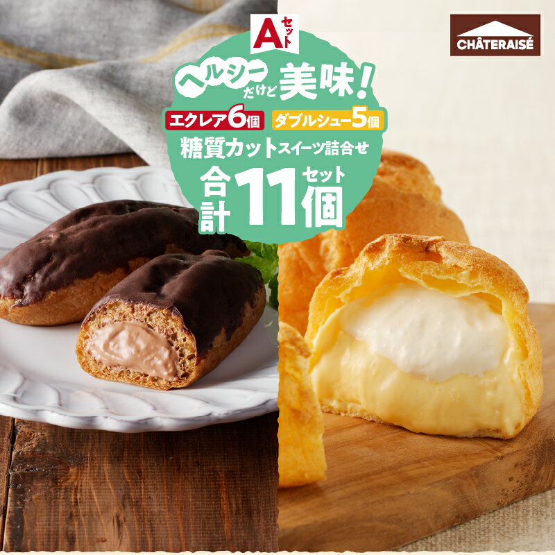 【糖質50%カットのチョコカスタードエクレア】 糖質を1個あたり8.2g(マルチトールを除く)(※1)に抑え、糖質を50%カットしました。 皮の口どけを改良し、ほんのりブランデーの香る濃厚なチョコカスタードクリームを詰めた大人向けのエクレアに仕上げました。 ※洋酒が入っていますので、お子様やアルコールに弱い方はご遠慮ください。 【濃厚カスタード ダブルシュークリーム】 【シャトレーゼ】の糖質50%(※1)カットのダブルシュー☆ 糖質を9.4gに抑えながらも、新鮮な卵たっぷりのカスタードを使用!!口どけのよいシュー皮の中になめらかなホイップクリーム、濃厚なホイップ入りカスタードクリームをたっぷり詰め込んだ、3つの味わいが調和したシュークリームです。 冷凍便でお送りいたしますので、ひんやりさっぱりアイスシューでもお召し上がりいただけますよ! ※1.日本食品標準成分表2015年版(七訂)シュークリームと比較した数値となります。 ※この返礼品については、地場産品基準に適合しています。 名称 【シャトレーゼ】糖質カットスイーツ詰め合わせ 2種Aセット 内容量 ・糖質50%カットのチョコカスタードエクレア:6個 ・糖質50%カットのダブルシュークリーム:5個 原材料 ・【糖質50%カットのチョコカスタードエクレア】 牛乳(国内製造)、乳等を主要原料とする食品、卵、チョコレート、食物繊維、ファッ