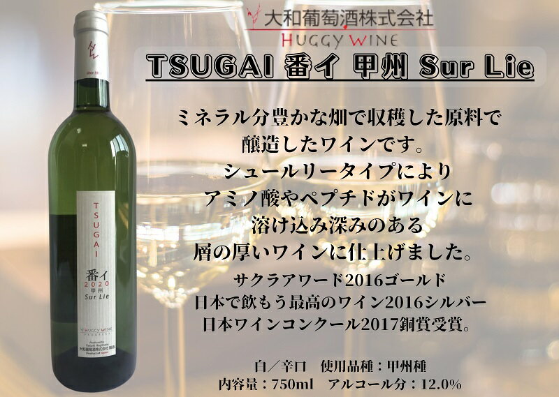 創業1913年と長い歴史を誇る大和葡萄酒より『番イ』と『時分』2種類の甲州ワイン飲み比べセットをお届けします。ミネラル分豊富な畑で収穫された原料を使用したシュールリータイプの『番イ』と甲州の柑橘系の香りと程よい酸味を最高の瞬間で仕上げた『時分』の2本セットになります。大和葡萄酒が贈る甲州ワイン飲み比べセットを是非一度ご賞味ください。 【番イ(つがい)】 種類:白ワイン タイプ:辛口 度数:12% 品種:甲州 特徴:ミネラル分豊富な畑で収穫した原料で醸造したワインです。シュールリータイプによりアミノ酸やペプチドがワインに溶け込み深みのある層の厚いワインに仕上げました。 【時分(じぶん)】 種類:白ワイン タイプ:辛口 度数:12% 品種:甲州 相性の良い料理:貝類の刺身・てんぷら・煮物 特徴:「時分」とはちょうどいいころあい。好機という意味を持ち、これを山梨県の主な品種である甲州種にて表現したワインです。甲州の柑橘系の香りと程よい酸味を最高の瞬間で仕上げたワインです。 大和葡萄酒が贈る『番イ』『時分』甲州ワイン飲み比べ2本セット(MG) 内容量 番イ(つがい) 750ml×1 時分(じぶん) 750ml×1 申込期日 通年 発送方法 常温 発送期日 入金確認後、順次発送予定 消費期限 開栓後は必ず冷蔵庫で保管し、お早めにお飲み下さい。 注意事項 ◆20歳未満の飲酒は法律で禁止されてい