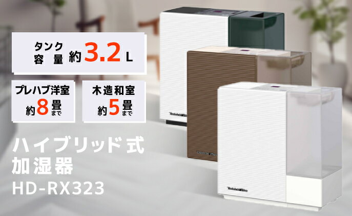 内容【商品内容】 ・加湿器本体/取扱説明書 【商品本体色】 3色よりお選びください。 ・0H51190 HD-RX323(T) ショコラブラウン ・0H51120 HD-RX323(W) サンドホワイト ・0H51130 HD-RX323(WK) ホワイト×ブラック 【商品仕様】 ・最大加湿量:300mL/h ・適用床面積:プレハブ洋室8畳(14平方メートル)まで、木造和室5畳・・・