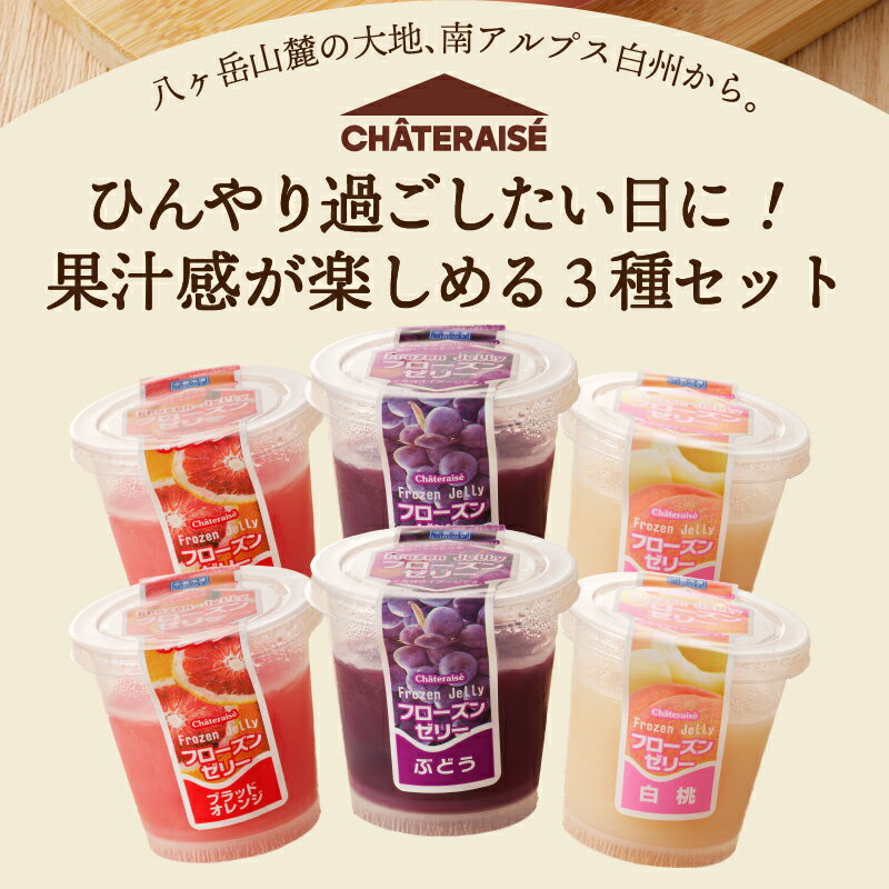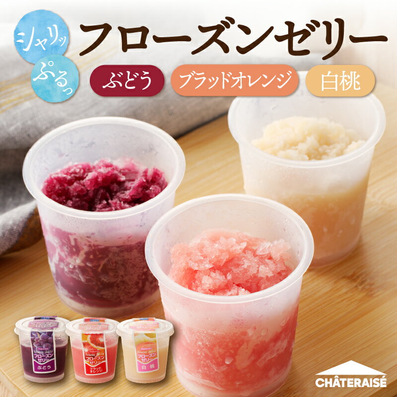 凍った状態でシャリッとシャーベット感を楽しむも◎ 解凍して瑞々しい口当たりのゼリー食感を楽しむも◎ あなたはどっち派ですか!? ※この返礼品については、地場産品基準に適合しています。 名称 【シャトレーゼ】フローズンゼリー3種食べ比べセット 内容量 ・フローズンゼリー ぶどう:5個 ・フローズンゼリー白桃:5個 ・フローズンゼリーブラッドオレンジ:5個 原材料 【フローズンゼリ・・・