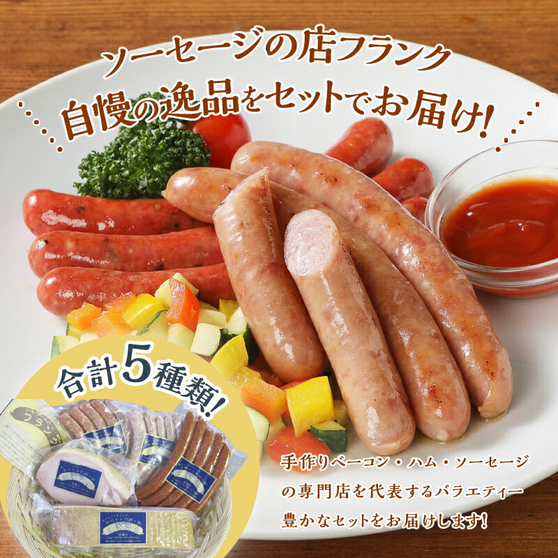 フランクの手作りソーセージ・ハム・ベーコンは南アルプス甲斐駒ヶ岳の麓、名水百選で知られる白州町で作られています。素朴でごく当たり前の製法にこだわり、作り続けています。弊社の人気どころを集めた商品です。 名称 フランクの手作りベーコン・ハムセット 原材料名 豚肉、豚バラ肉、豚ロース肉、でん粉、食塩、砂糖、香辛料、大葉、種もの(バジル)/紅麹色素、リン酸塩(Na,K)、調味料(アミ・・・