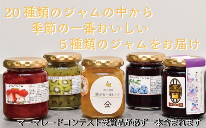 名称いちごジャム、白桃ジャム、みかんジャム、梨ジャム、りんごジャム内容量いちごジャム(145g)ブルーベリージャム(145g)白桃ジャム(145g)いちじくジャム(145g)ルバーブジャム(140g)キウイフルーツジャム(145g)みかんジャム(145g)プラムジャム(145g)梨ジャム(140g)カシスリキュールジャム(145g)ミックスベリージャム(145g)りんごジャム(140g)苺&ラズベリージャム(140g)トマトジャム(140g)ゆずマーマレード(150g・金賞)柑橘マーマレード(150g・金賞)甘夏マーマレード(150g・銀賞)ライムマーマレード(150g・金賞)金柑マーマレード(150g・金賞)レモンマーマレード(150g・銅賞)のうち、季節に応じて一番美味しい商品5本をセットにしてご発送。英国開催の世界的なマーマレードコンテスト受賞作品を1本必ずお入れします。原材料いちごジャム: 紅ほっぺ苺(静岡県産)、甜菜グラニュー糖(北海道産)、レモン果汁(静岡県産)白桃ジャム: ちよひめ白桃(静岡県産)、甜菜グラニュー糖(北海道産)、レモン果汁(静岡県産)みかんジャム: みかん(静岡県産)、甜菜グラニュー糖(北海道産)梨ジャム: 梨・喜水(静岡県産)、甜菜グラニュー糖(北海道産)りんごジャム: りんご(静岡県産)、甜菜グラニュー糖(北海道産)、レモン果汁(静岡県産)賞味期限