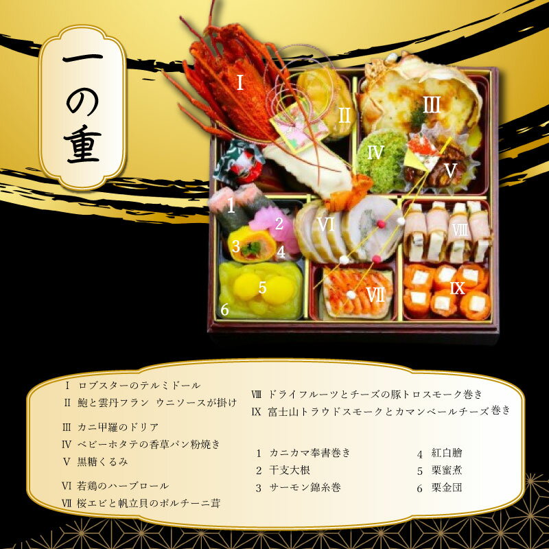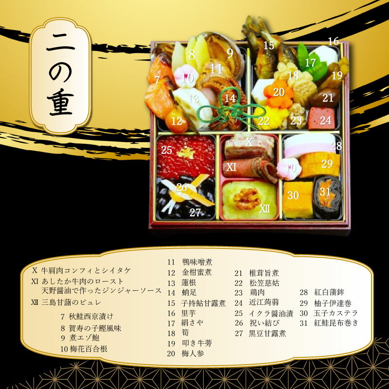 返礼品説明 名称 【ふるさと納税】 2024年 新作おちせ 和洋創作 二段重 返礼品説明 沼津リバーサイドホテルの和食・洋食の料理人による創作二段重のおせちです。 お料理は静岡県東部をはじめとする季節の食材を日本料理の技術とフレンチの技法により手作りされる 華やかで味わい深い逸品です。 初春の食卓にふさわしい華やかな盛り込みでご家族の笑顔が広がるおせち料理です。 提供元:沼津リバーサイドホテル 内容量 【一の重】 ロブスターのテルミドール 鮑と雲丹フラン ウニソースが掛け カニ甲羅のドリア ベビーホタテの香草パン粉焼き 黒糖くるみ 若鶏のハーブロール 桜エビと帆立貝のポルチーニ茸 ドライフルーツとチーズの豚トロスモーク巻き 富士山トラウドスモークとカマンベールチーズ巻き カニカマ奉書巻き 干支大根 サーモン錦糸巻 紅白膾 栗蜜煮 栗金団 【 二の重】 牛肩肉コンフィとシイタケ あしたか牛肉のロースト 天野醤油で作ったジンジャーソース 三島甘藷のピュレ 秋鮭西京漬け 賀寿の子鰹風味 煮エゾ鮑 梅花百合根 鴨味噌煮 金柑蜜煮 蓮根 蛸足 イクラ醤油漬 祝い結び 黒豆甘露煮 子持鮎甘露煮 里芋 絹さや 筍 叩き牛蒡 梅人参 椎茸旨煮 松笠慈姑 鶏肉 近江蒟蒻 紅白蒲鉾 柚子伊達巻 玉子カステラ 紅鮭昆布巻き 内容は変更になる場合がございます。ご了承ください。 外寸縦12×横12×高12c
