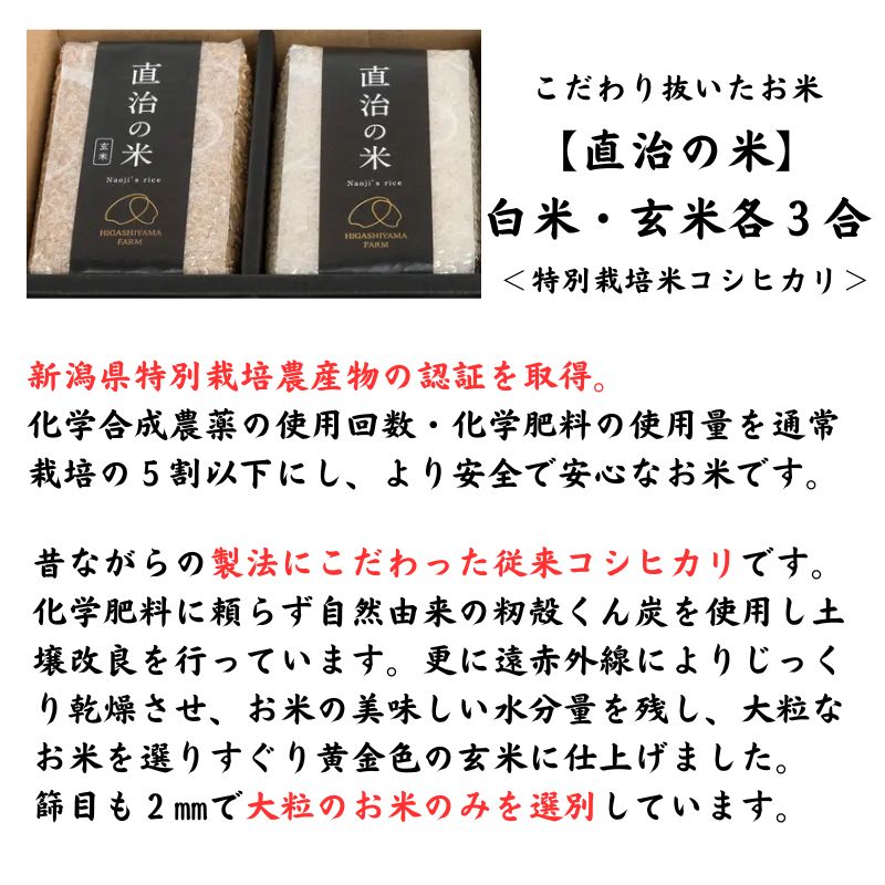 お祝いや、お歳暮・お中元にどうぞ見栄えが良くて、もちろん美味しい!新潟県特別栽培農産物の認証を取得。化学合成農薬の使用回数・化学肥料の使用量を通常栽培の5割以下にし、より安全で安心なお米です。 燻炭を利用し昔ながらの製法で栽培、大粒のみを選別したこだわり抜いたお米【直治の米】白米・玄米各3合 新潟県のブランド米、人気のお米【新之助】白米・玄米各3合 古来から祝いのお米(もち米)・・・