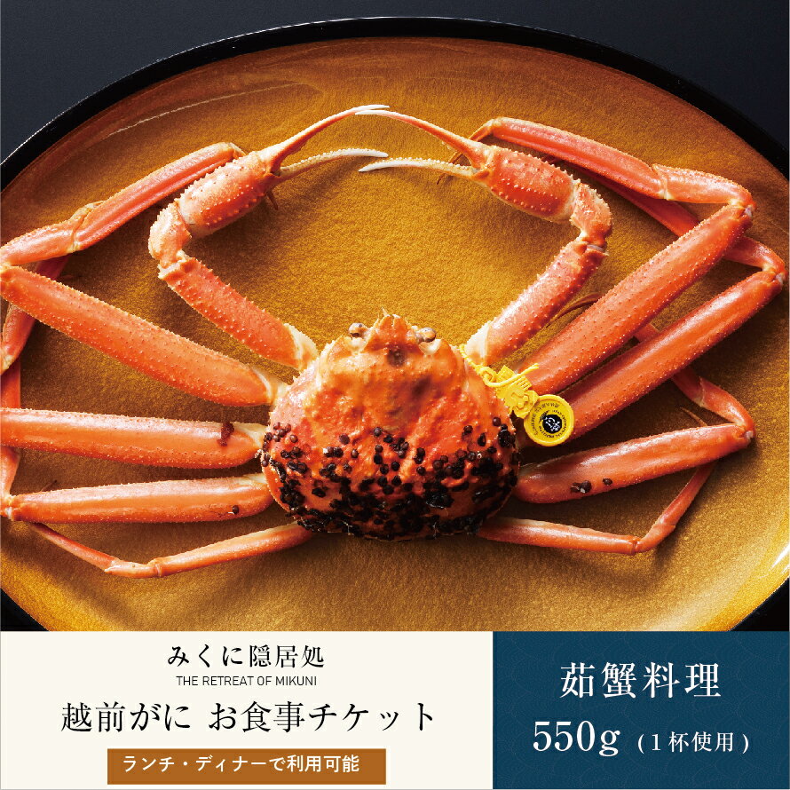 越前がに約550g1杯の茹蟹料理が食べられるお食事チケット。 ご家族やご夫婦、ご友人などと越前蟹料理を楽しむ際にご利用できます。 入金確認後、坂井市より感謝券発行 【感謝券有効期限】寄附完了した月の翌年月末まで (例:10月中に寄附完了した場合、翌年の10月末まで) ※感謝券には旅費等は含まれておりません。 福井で美味しい越前がにが食べられる!! 蟹料理の名店、みくに隠居処で越前がにが食べられるお食事チケット。 本チケットで越前がに約550gの茹で蟹が1杯丸ごと食べられます! ●ここが他と違う ポイントその1 市場直送の蟹を生簀で管理。 蟹の口から海底の泥と排泄物を出し切らせたものを使用。 →蟹の等級基準が最も厳しいと言われる福井県三国港で水揚げされた、ブランド黄色タグ付きのせいこがにを、専用の生簀に入れしっかり管理。 蟹の体内に溜まった海底の泥や排泄物などを3~5日間かけ出すことで、えぐみや砂を嚙んだような舌ざわりを完全除去。 美味しさの秘訣になります。 ●ここが他と違う ポイントその2 専用の蟹鍋で一気に茹で上げ! 美味しさの秘密は、塩職人と共同開発した茹蟹専用の塩 →超高温で一気に茹で上げることが出来る専用の蟹鍋に、福井県でも有名な「越前海岸」の塩職人と共同開発した茹蟹専用の塩を入れ茹でます。 蟹の素材本来の旨みを最大限引き出し、上品でしっかりとした蟹の味をお楽しみいただけま
