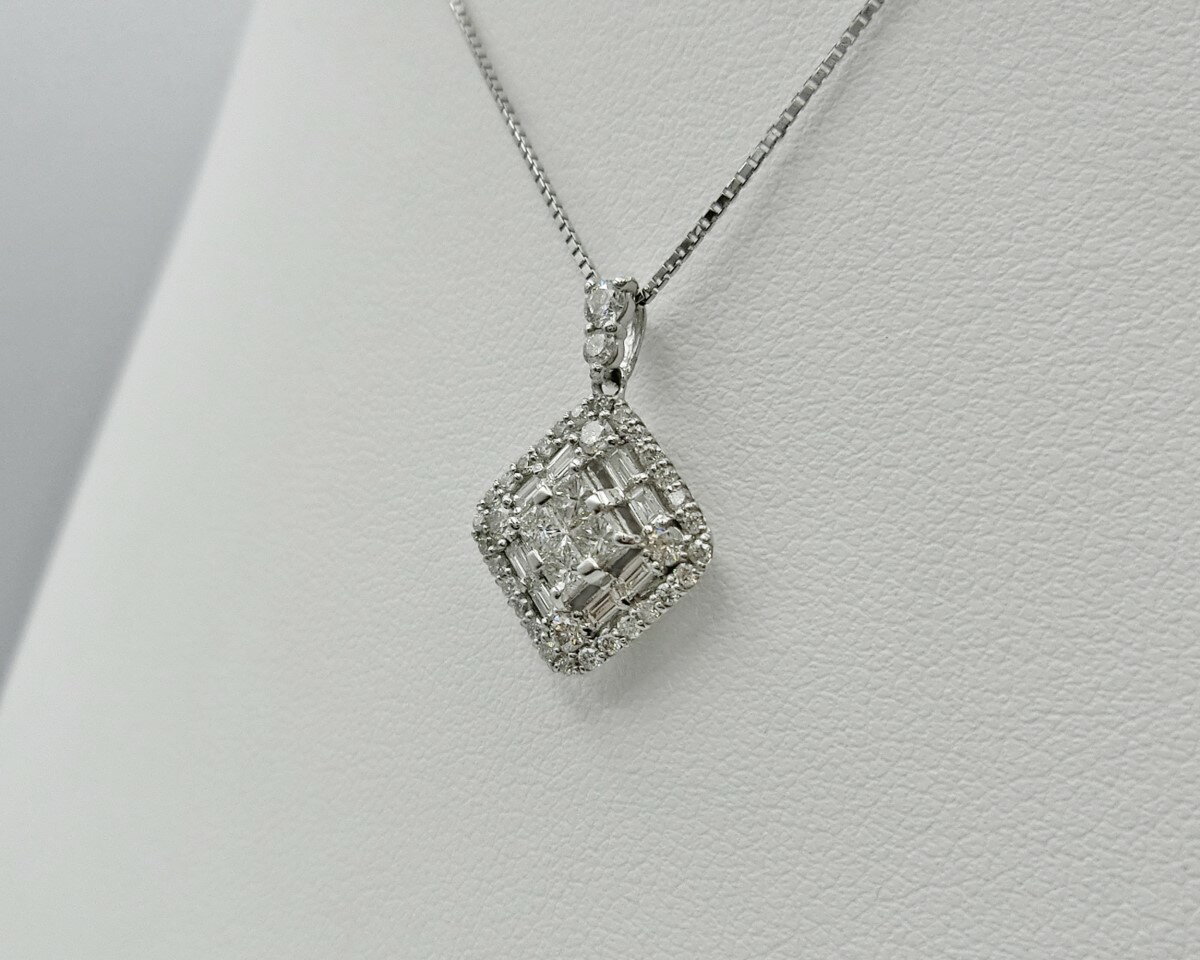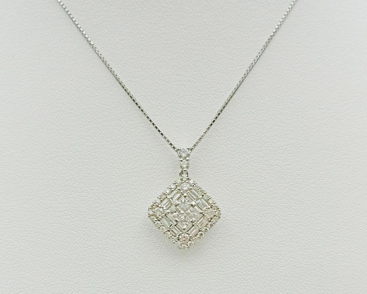 ファンシーカットダイヤモンドのプリンセスカット、バゲットカット、ラウンドカットを贅沢に使用したダイヤモンドペンダントネックレスです。 チェーンはムーブタイプ(スライド式)を使用しており、最長約45cmまでスタイルに合わせて自由に調節が出来ます。 結婚式やパーティーはもちろん、シンプルなデザインですので普段使いとしてもご愛用いただけます。 クリスマスや誕生日、記念日などの贈り物や・・・