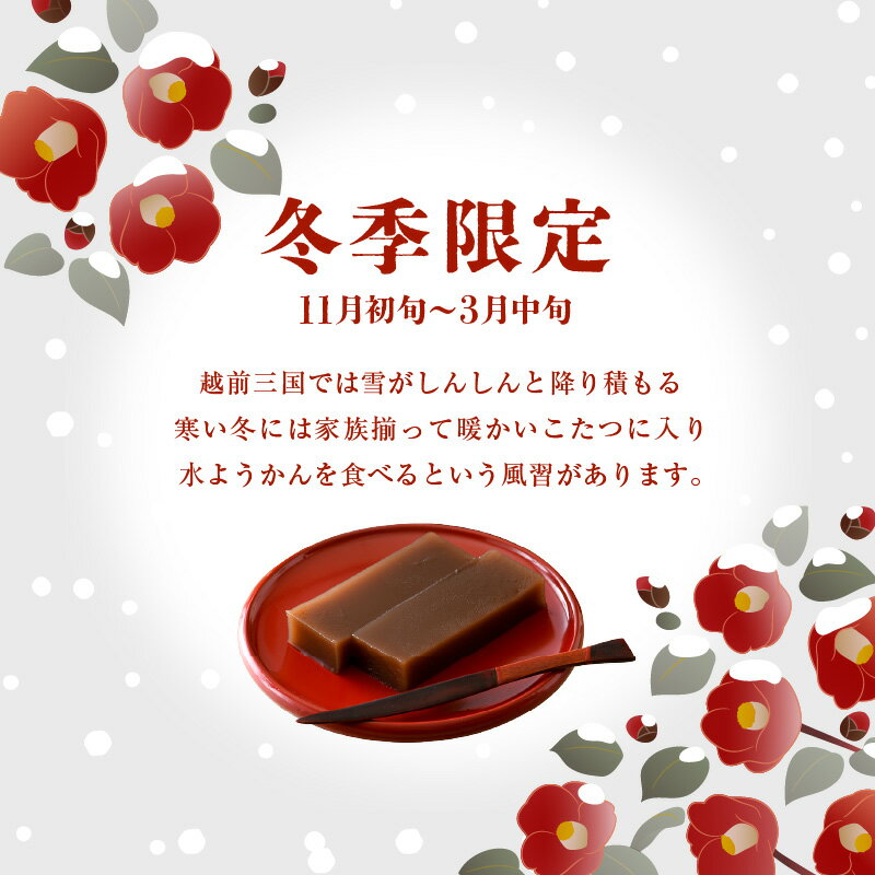 餡の風味を最大限に活かし、上品な優しい味に仕上げたどこか懐かしい越前三国の冬の味です。 越前三国では雪がしんしんと降り積もる寒い冬には家族揃って暖かいこたつに入って水ようかんを食べるという風習があります。 にしさかの水ようかんは“あんの美味しさ”に特にこだわっています。 丁寧に炊き上げることで、上品な味に仕上がっています。 11月初旬より3月中旬までの季節限定商品です。 ※商品・・・
