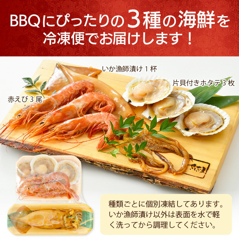【ふるさと納税】厳選!海鮮 BBQ ≪D≫セット(3種7品、2〜3人用)するめいか漁師漬け えび 帆立 バーベキュー アウトドア 網焼き 冷凍便 [e04-a068]・・・