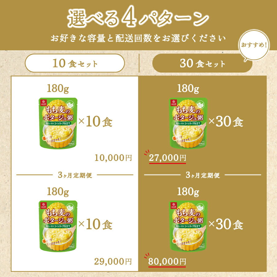 【ふるさと納税】 おかゆ レトルト もち麦 180g 選べる容量 10食入 30食入 選べる配送回数 1回 定期便 3回 パウチ 常温保存 かゆ 米飯類 防災 備蓄 非常食 ローリングストック ポタージュ粥 コーンスープ仕立て はくばく・・・