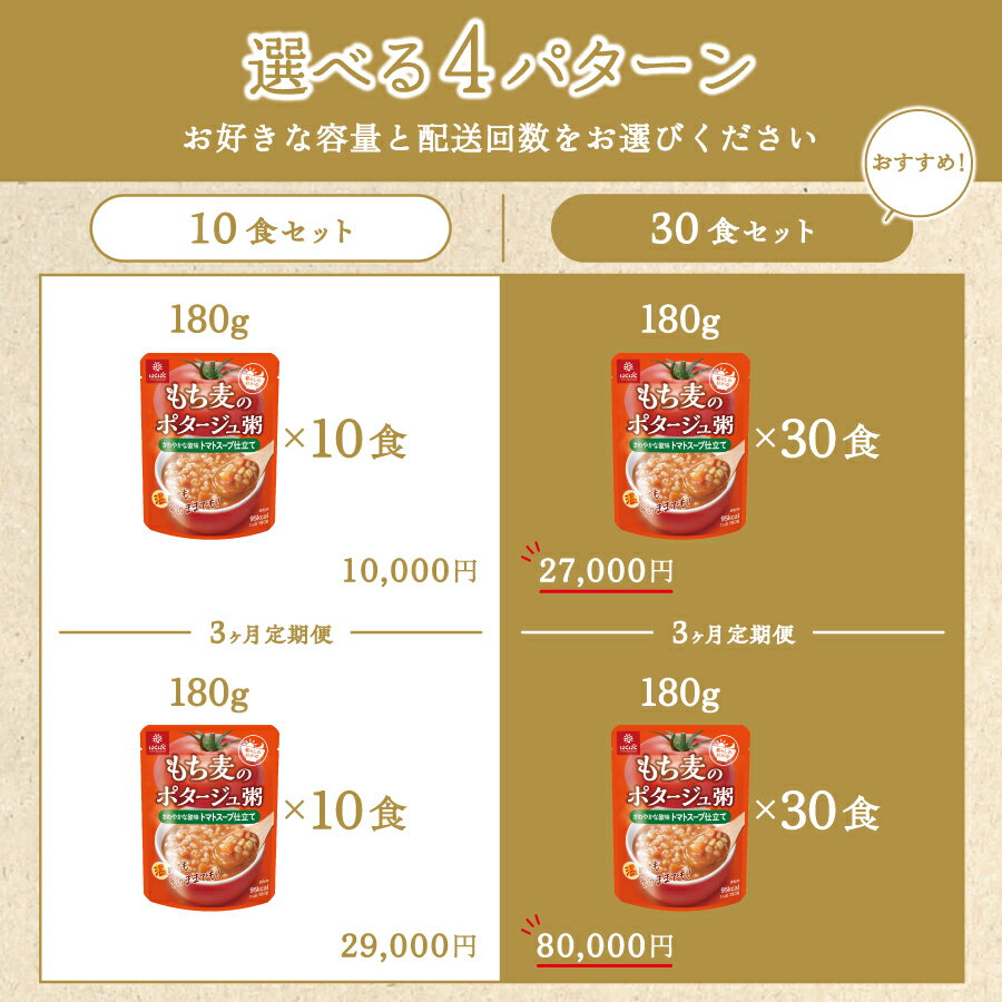【ふるさと納税】 おかゆ レトルト もち麦 180g 選べる容量 10食入 30食入 選べる配送回数 1回 定期便 3回 パウチ 常温保存 かゆ 米飯類 防災 備蓄 非常食 ローリングストック ポタージュ粥 トマトスープ仕立て はくばく・・・
