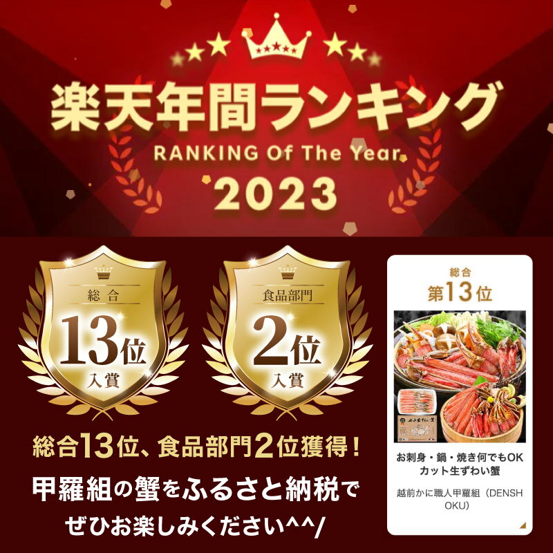 「カニは好きだけど、食べるのが面倒…」「食べるのに夢中になって、無言になってしまう…」「身の詰まっていない不良品が送られてきそう…」そんなお客様のお声をもとに、この【カット生ずわい蟹】は2011年に開発された商品です。 新鮮なズワイガニを厳選し、包丁や調理バサミがなくても簡単に食べられるように、カニの足を1本ずつ職人が丁寧にカットしてお届けしております。 販売開始から5年目にして、お刺身でも食べられる商品化に成功しました。カニ本来の甘味が繊維の一本一本にぎっしりと詰っていて、まさに「とろける甘さ」が絶品です!カニ刺し、しゃぶしゃぶ、鍋、雑炊、焼きガニ、てんぷら…専門店でしか食べられない本格かに料理のフルコースを、家族みんなで手軽に、存分にお楽しみ頂けると確信しております。 ※お届け日のご指定は、承ることができません。予めご了承ください。 ※長期ご不在にされる場合は、お申し込み時に【その他のご要望】欄に「不在期間〇〇/〇〇〜〇〇/〇〇」とご入力ください。 ※一部離島への配送はできません。(冷凍便対応不可地域) 商品詳細 名称 【ふるさと納税】【お刺身OK】甲羅組のカット生ずわい蟹 700g(総重量950g前後) 内容量 カット生ずわい蟹 700g(総重量950g前後)(最終加工地:敦賀市) 外箱サイズ(1箱):約24cm×34cm×6cm 原材料 ずわいかに(カナダ産、アメリカ産、ロ