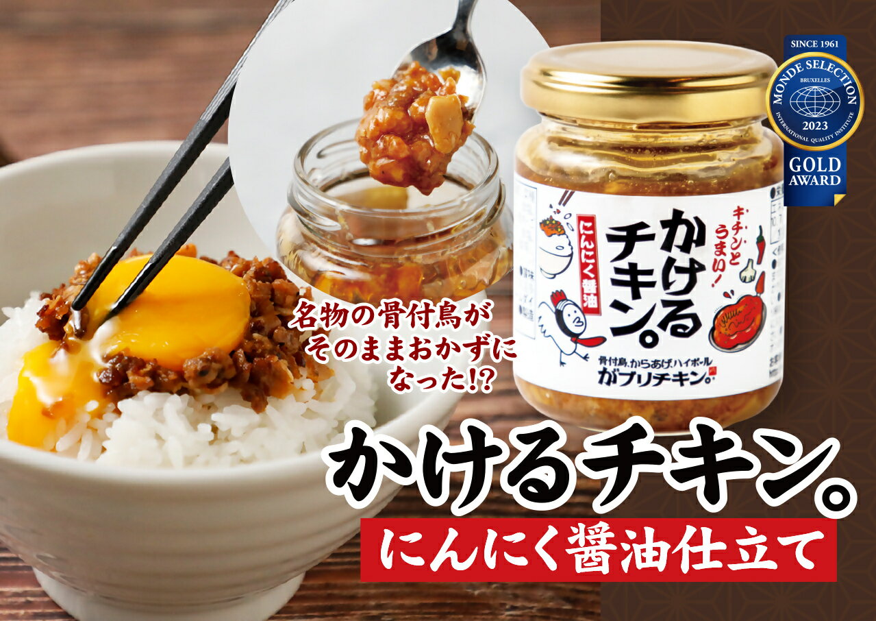 2023年モンドセレクション金賞受賞がブリチキン。が本気で作った万能調味料「かけるチキン。」。おや鶏を瓶詰めにし、にんにく醤油とブラックペッパーの刺激を効かせた旨味たっぷりのチキンが特徴です。お酒のおつまみやごはんのおとも、うどんにかけても抜群です。返礼品説明名称かけるチキン。にんにく醤油仕立て容量単品サイズ:78mm×55mm×55mm内容量:85g×4個原材料鶏肉(国産)、菜種油、骨付鳥調味液(おろし玉ねぎ、おろしにんにく、食塩、ぶどう糖果糖液糖、香辛料、その他)(小麦・大豆・豚肉・ごまを含む)、フライドオニオン、砂糖、ガーリック、食塩、粉末醤油/甘味料(ソルビット)、調味料(アミノ酸等)、乳化剤、pH調整剤、加工でん粉、増粘剤(キサンタン)、パプリカ色素、香辛料抽出物、香料アレルギー小麦、鶏肉、大豆、豚肉、ごま保存方法常温賞味期限製造より360日提供事業者株式会社ブルームダイニングサービス備考北海道、沖縄、離島は配送対象外となります。注意事項・油が分離している場合がありますが、清潔なスプーンでよく混ぜてお召し上がりください。・開封後はキャップをしっかり締め、立てて冷蔵庫(10℃以下)に入れ早めにお召し上がりください。・黒い皮等はフライドオニオンの原料由来のものです。 ・ふるさと納税よくある質問はこちら ・寄附申込みのキャンセル、返礼品の変更・返品はできません。あらかじめご了承