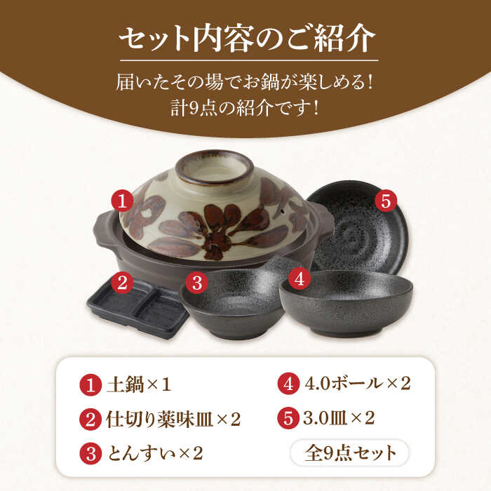 【ふるさと納税】【美濃焼】8号土鍋と食器2人用セット フタ・サビ唐草/鍋小物・黒御影 (昭和製陶)【cierto】食器 鍋 とんすい [MCD173] 画像1