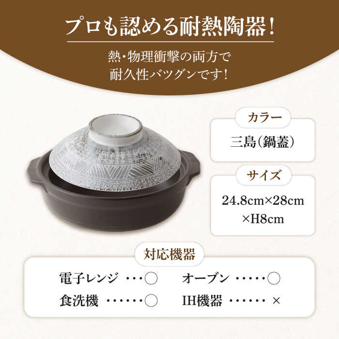 超耐熱陶器という素材を使用した飲食店様用に生産される土鍋です。 直火・オーブン対応、一般の土鍋に比べ、熱衝撃・物理衝撃の両面で耐久性に優れています。(IHには対応しておりません) 2人〜3人用として使用される8号土鍋。 この土鍋に便利な鍋小物(とんすい・小鉢・小皿・薬味皿)をセッティングしたオリジナル土鍋セットです。 【昭和製陶のものづくり】 昭和製陶は、1927年の創業以来陶磁器メーカーとして新しい技術と商品の開発に取り組んでまいりました。 長年にわたり培ってきた経験と実績を活かし、これからも美濃焼、ひいては日本の技術・文化の結晶である 陶磁器を、窯元のまち駄知から世界へと発信していきます。原産国:日本 産地:岐阜県 土岐市 素材:美濃焼 土鍋/耐熱陶器 食器/磁器 点数:土鍋×1 とんすい×2 4.0ボール×2 仕切り薬味皿×2 3.0皿×2 サイズ:土鍋 24.8×28×H8cm 容量 2000cc とんすい 12.5×14.3×H5.8cm 4.0ボール Φ13×H4.5cm 仕切り薬味皿 13×8.1×H2.8cm 3.0小皿 Φ9.5×H2.2cm 【注意事項/その他】 ・研磨剤、研磨剤入り洗剤、金属たわし等を使用すると、表面に傷がつく恐れがある為、 使用を避け、柔らかいスポンジで洗ってください。 ・ひびや亀裂が入った時は安全のためにご使用をおやめください。 ・画像はイ