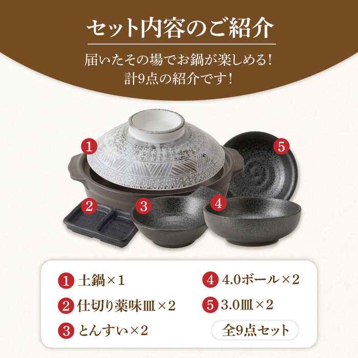 【ふるさと納税】【美濃焼】8号土鍋と食器2人用セット フタ・三島/鍋小物・黒御影 (昭和製陶)【cierto】食器 鍋 とんすい [MCD174]
